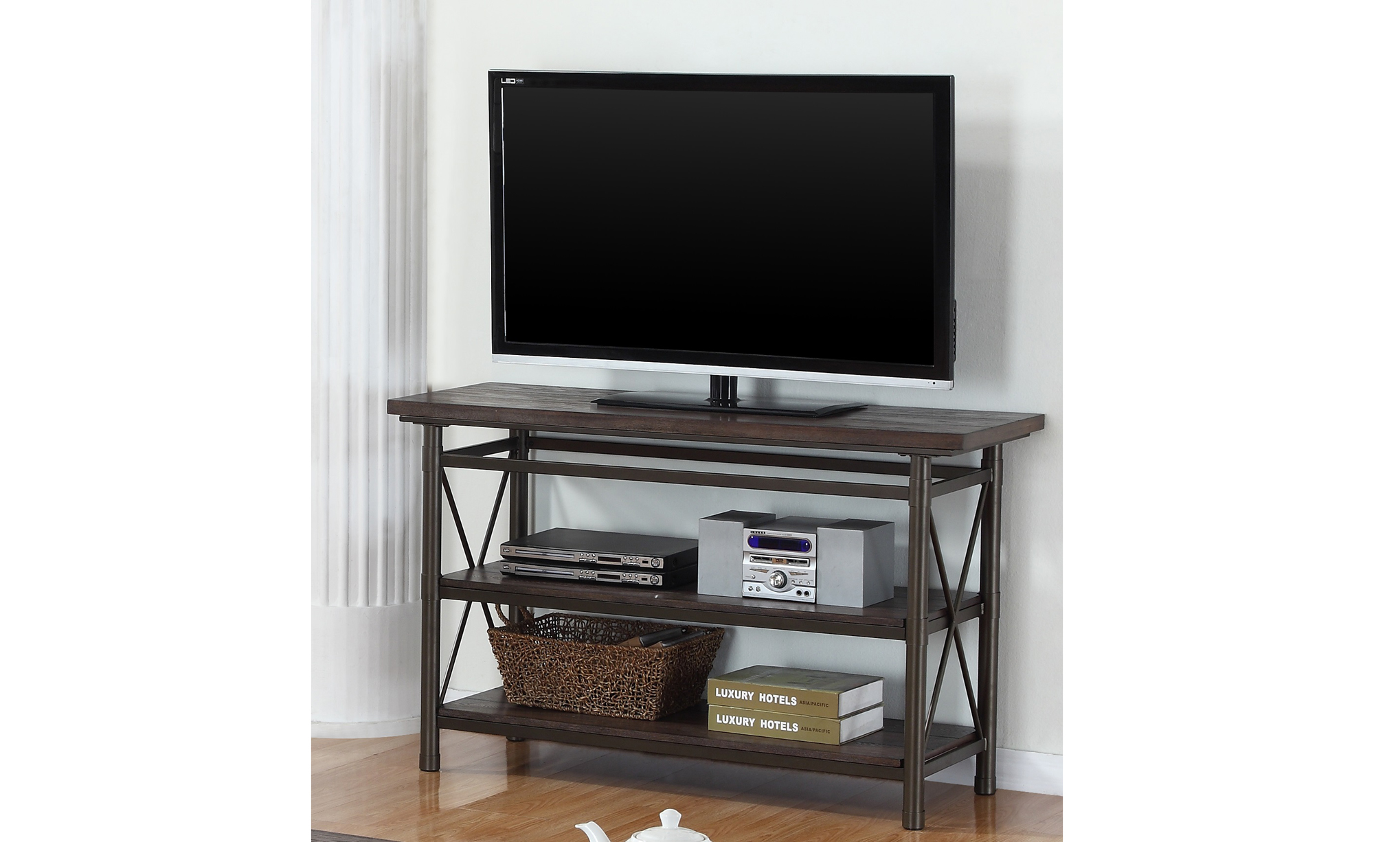 Features a dark walnut finish, plank look top, display storage shelves, and a durable metal frame. | |