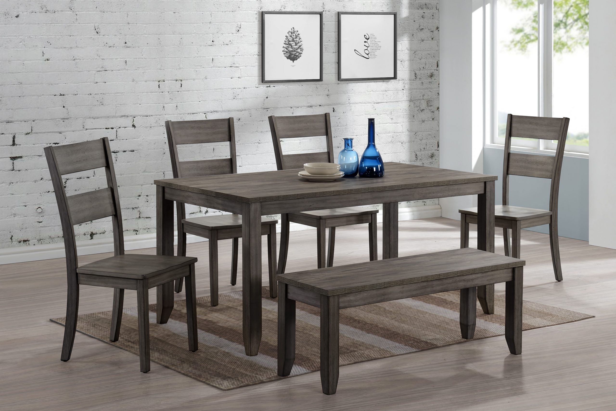 Grey Finish Melamine Finish (Table/Bench Tops) & Veneers Table Ships in 1 Box / Side Chairs Ship 2 Per Box / Bench Ships 1 Per Box Solid Top (No Leaf) (Table Top & Bench) Heat, Moisture & Stain Resistant Solid Tapered Legs Ladder Back Chair DesignRead More