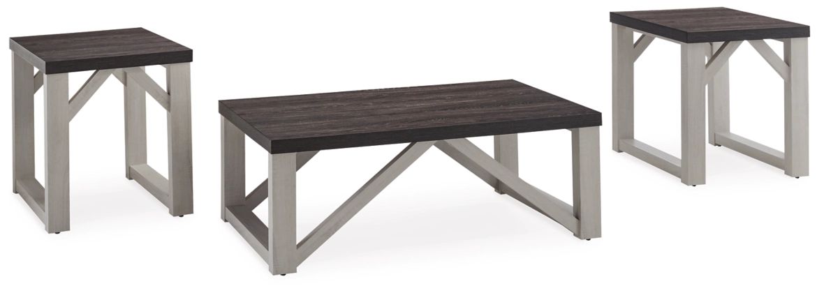 With an antiqued finish, plank-effect styling and an angled brace design, the Dorrinson table set is sure to elevate the look and feel of a room. Whether you embrace cottage chic or fancy modern farmhouse decor, these tables will look right at home flanking a sofa or chair. Includes coffee table and 2 end tables Made of decorative laminate and MDF substrate Replicated gray wood top Antiqued white base Assembly requiredRead More