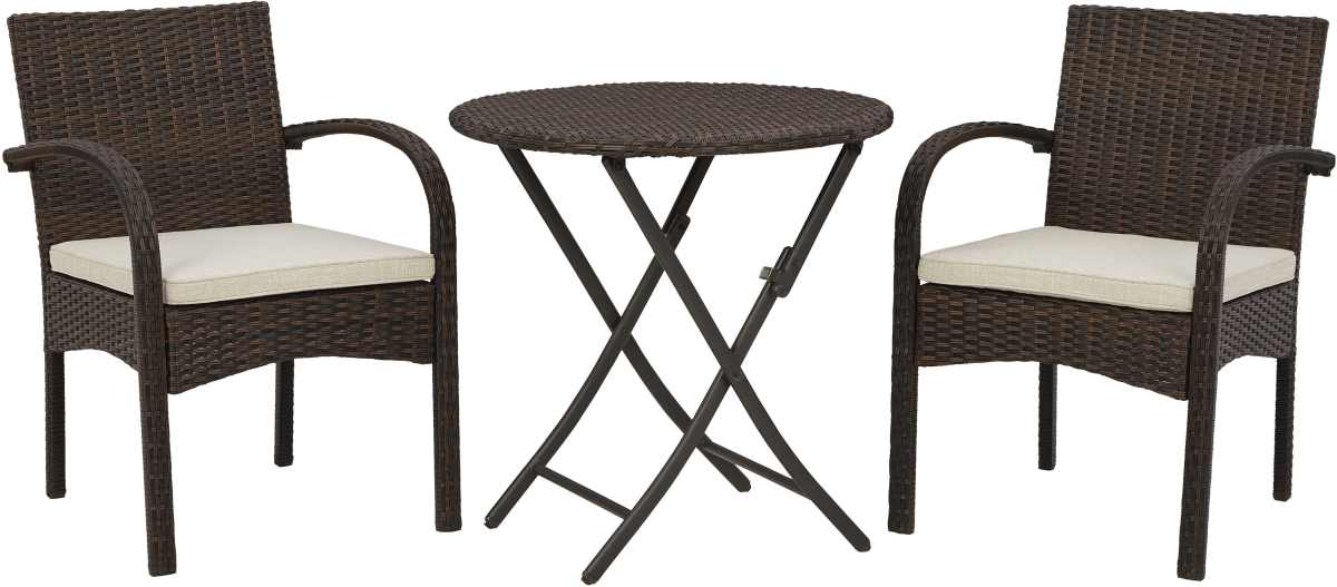 This 3-piece bistro set is just what you need to shape up an outdoor space. A natural fit on front porches, back patios, balconies and beyond, this trendy trio is quality made with woven resin over a powder coated steel frame for exceptional durability. All-weather cushions are covered in Nuvella® fabric that’s a breeze to clean. The fact that the tabletop folds down for storage makes this outdoor set that much more appealing.