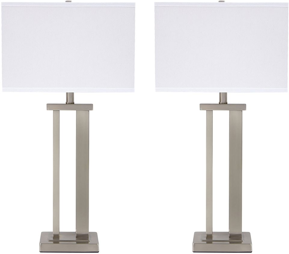 The linear, metal frame design on this set of 2 Aniela lamps is a perfect finishing statement to any room. With a 3-way switch, illuminate your home with soft lighting cast from the bold, hardback shade.