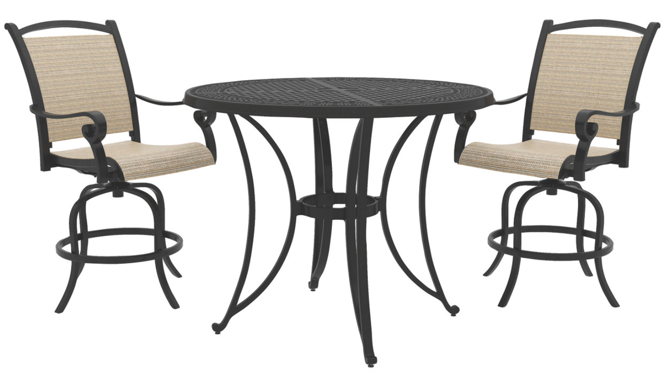 Delight in cold drinks and refreshments at the weather-proof Bass Lake round bar table and keep an eye on the grill from the bar-height swivel stools. This 3-piece outdoor set is made to endure the seasons so you can enjoy good times.