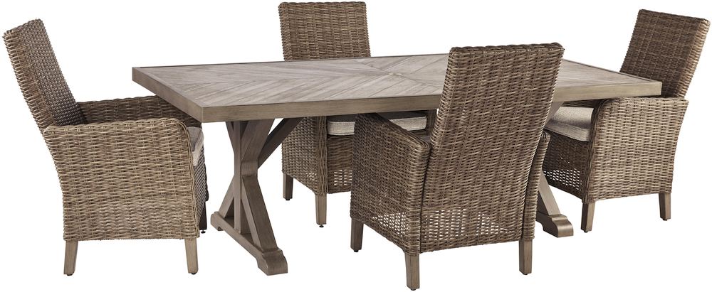 Dine al fresco in casual farmhouse flair with the Beachcroft, 5-piece dining table set. This arrangement includes 4 all-weather cushioned arm chairs and spacious porcelain top table with dining space for up to 8.