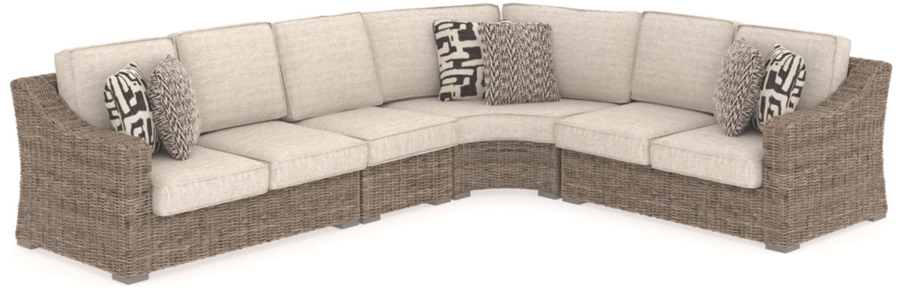 For indoor or outdoor use. Cushioned resin wicker dining and modular seating. 4 throw pillows included with LAF/RAF loveseat. 2 throw pillows included with curved corner chair. Dining, cocktail and end tables have porcelain tops. Rust free aluminum frames. Some assembly required. High performance Nuvella fabric. Collection includes many dining and seating options. P791-701/702/625 are porcelain tops.