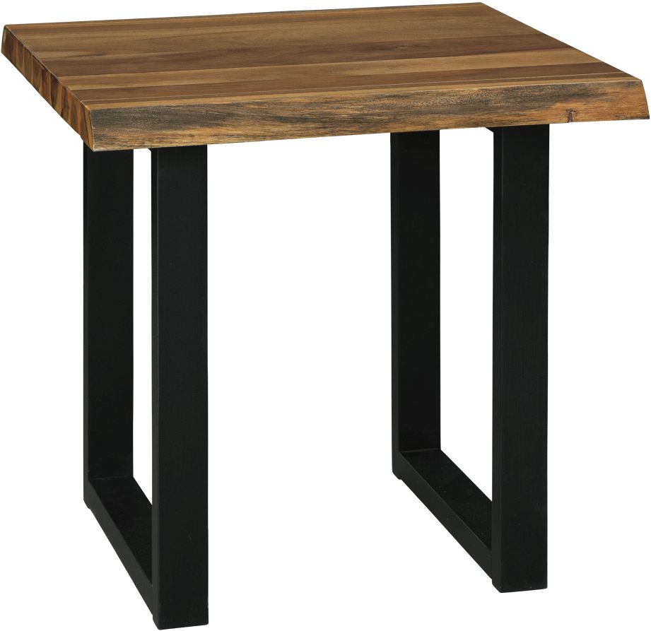 This Brosward end table offers an exposed metal frame and an acacia wood block top in a replicated live edge design and glossy finish.