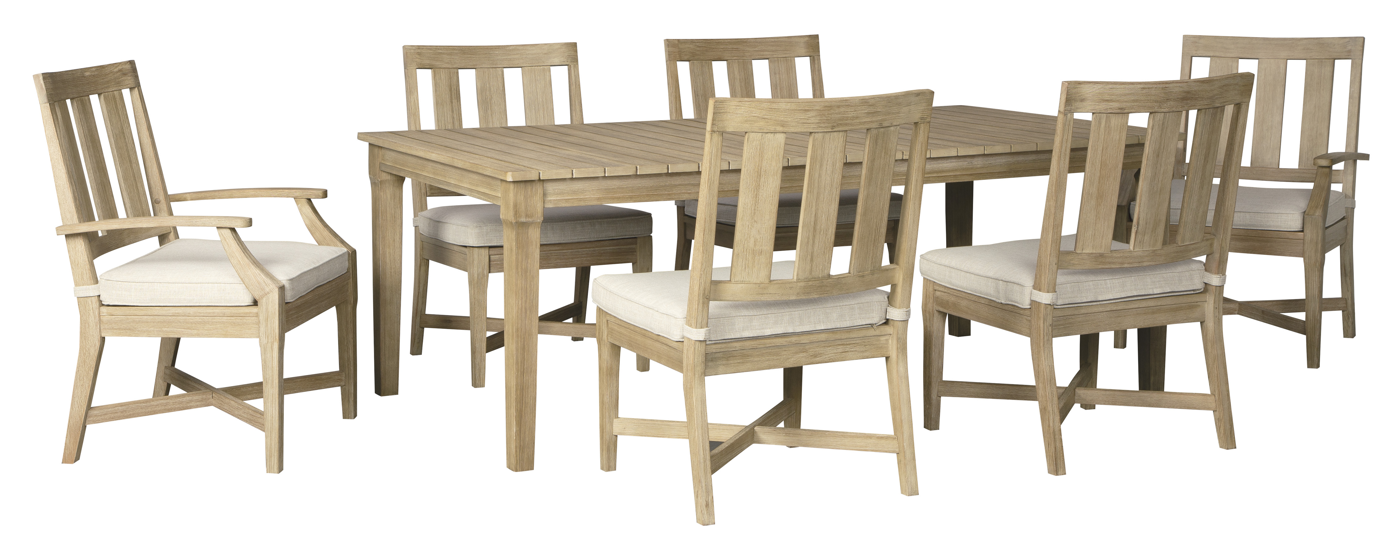 Enjoy the outdoors and good company on the Clare View 7-piece patio set. Complete with a rectangular table and 2 armchairs, 4 side chairs, and slat-style design, this seating setup is created for style and function.