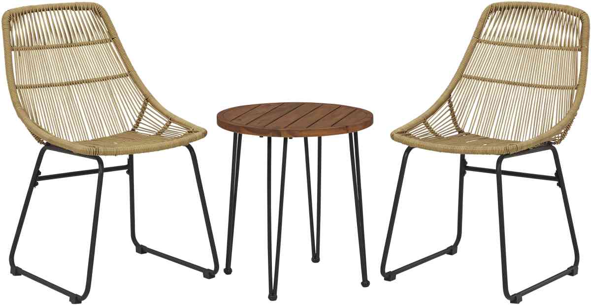 Whether your vision is island escape or urban oasis, this 3-piece conversation set will take you there in style. Mixing it up in a high-design way, this outdoor furniture set is quality made with sleek yet sturdy black steel frames in a powder coated finish, resin wicker basket seats and an acacia wood topped table loaded with tonal interest.Read More