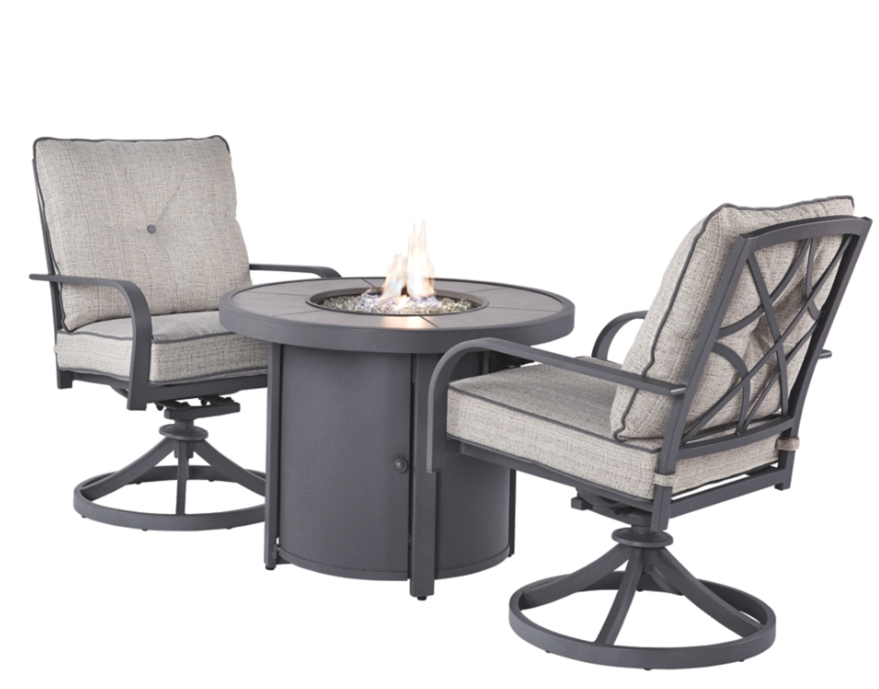 The Donnalee Bay 3-piece fire pit chat set includes 2 swivel lounge chairs and 1 fire pit table. Materials are weather-proof and allow for ideal longevity no matter the climate.
