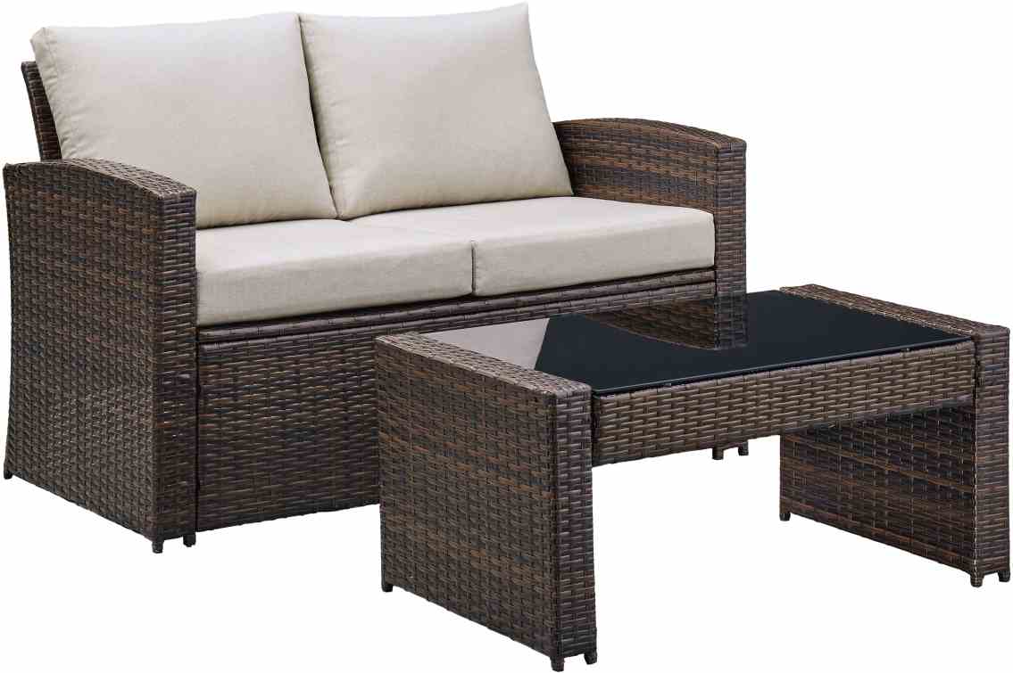 This East Brook outdoor set features a dark brown loveseat paired with a glass top table. These matching pieces will bring an unique and stylish atmosphere to any patio.