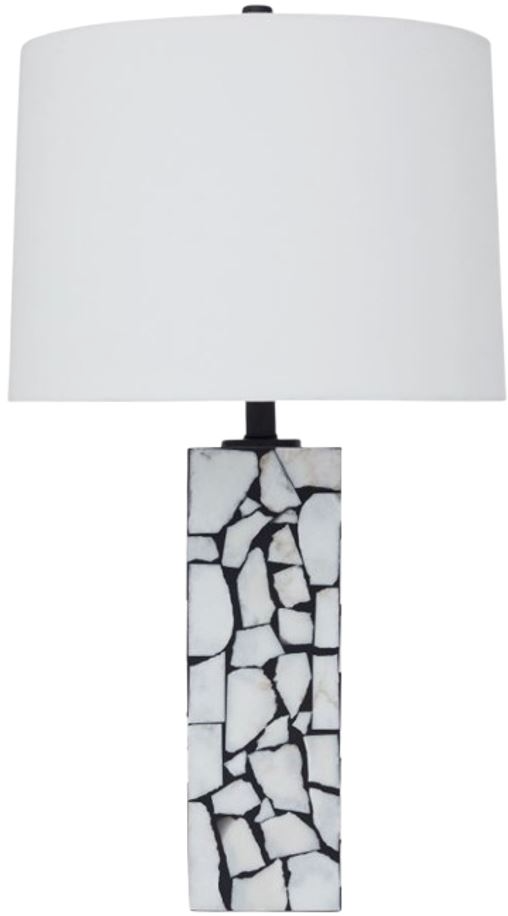 This exquisite table lamp is artfully adorned, with a mosaic pattern of white marble playing beautifully against a black background. Complemented by a modified drum shade for a sophisticated sensibility, the lamp casts an elegant glow in the entryway or living area.Read More