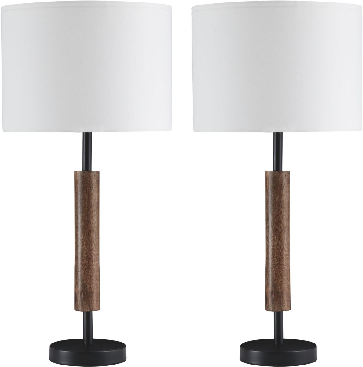 This set of 2 table lamps in the Maliny collection features a black finished rod surrounded by a dark brown wooden dowel. Each lamp uses a modified drum shade to create a pleasant, warm glow.