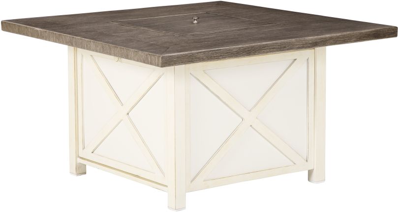 Bring the relaxed aesthetic of modern farmhouse design outdoors with this square fire pit table. Finished in a creamy white painted style with a wood look top, its rust-proof aluminum frame ensures carefree living. Sporting iconic cross buck styling, this fire pit table brings a home-on-the-range feeling to backyard entertaining. Stainless steel burner with glass beads adds a captivating element sure to wow.