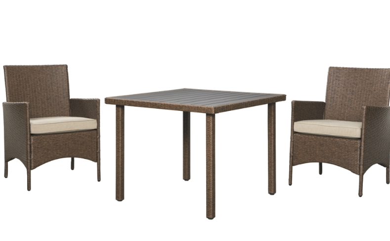The Reedenhurst square dining table seat features 1 outdoor table and 2 chairs, built from all-weather wicker over a rust-proof aluminum frame. The seat pads are upholstered with Nuvella® fabric and use all-weather foam so you can enjoy relaxing outside, season after season.
