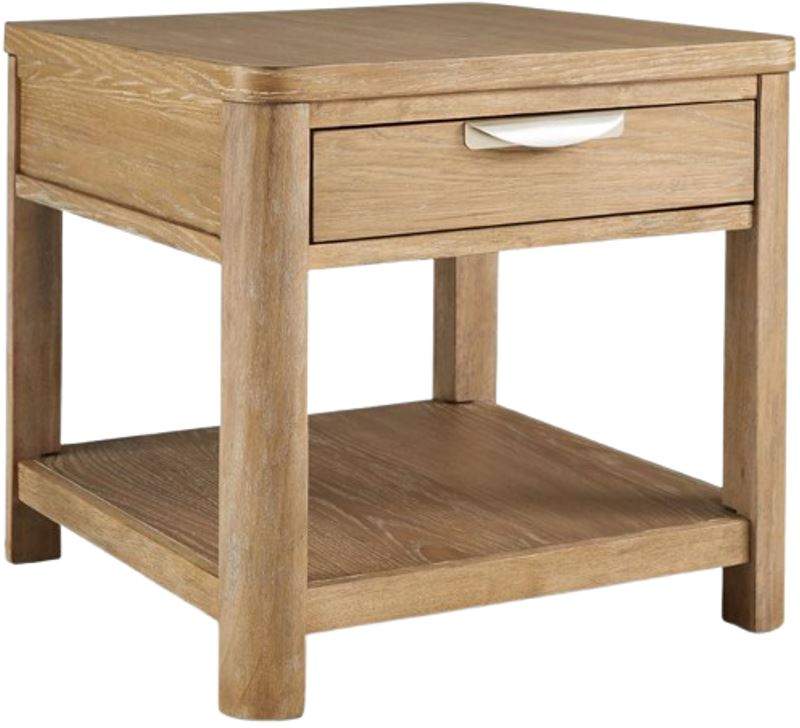 This end table's classic yet contemporary good looks are hard to deny. Softly shaped posts with a light oak finish and wire-brushed wood grain texture lend an organic appeal to your soothing space. A roomy drawer caters to additional storage needs while keeping clutter at bay.Read More