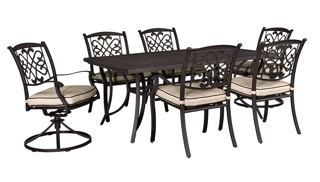 ith the Burnella 7-piece outdoor rectangular dining set, there's plenty of room at the table. The generously scaled rectangular table seats up to six, with rainwater draining quickly through the lattice top. Durable rust-resistant cast aluminum serves stylishly through the seasons. All-weather Nuvella® cushions are colourfast and secure to the dining chair frames.Read More