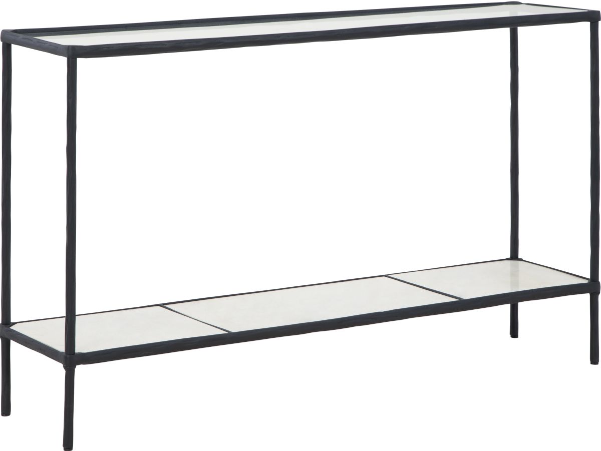 Classic in design with a dash of textural appeal, this console table provides both flair and function. It's ideal to rest behind a couch or in an entryway, with a glass tabletop and white marble lower shelf offering the perfect perch for decorative pieces. The frame's antiqued black finish has an edgy look that remains versatile, suiting spaces from casual to contemporary.Read More