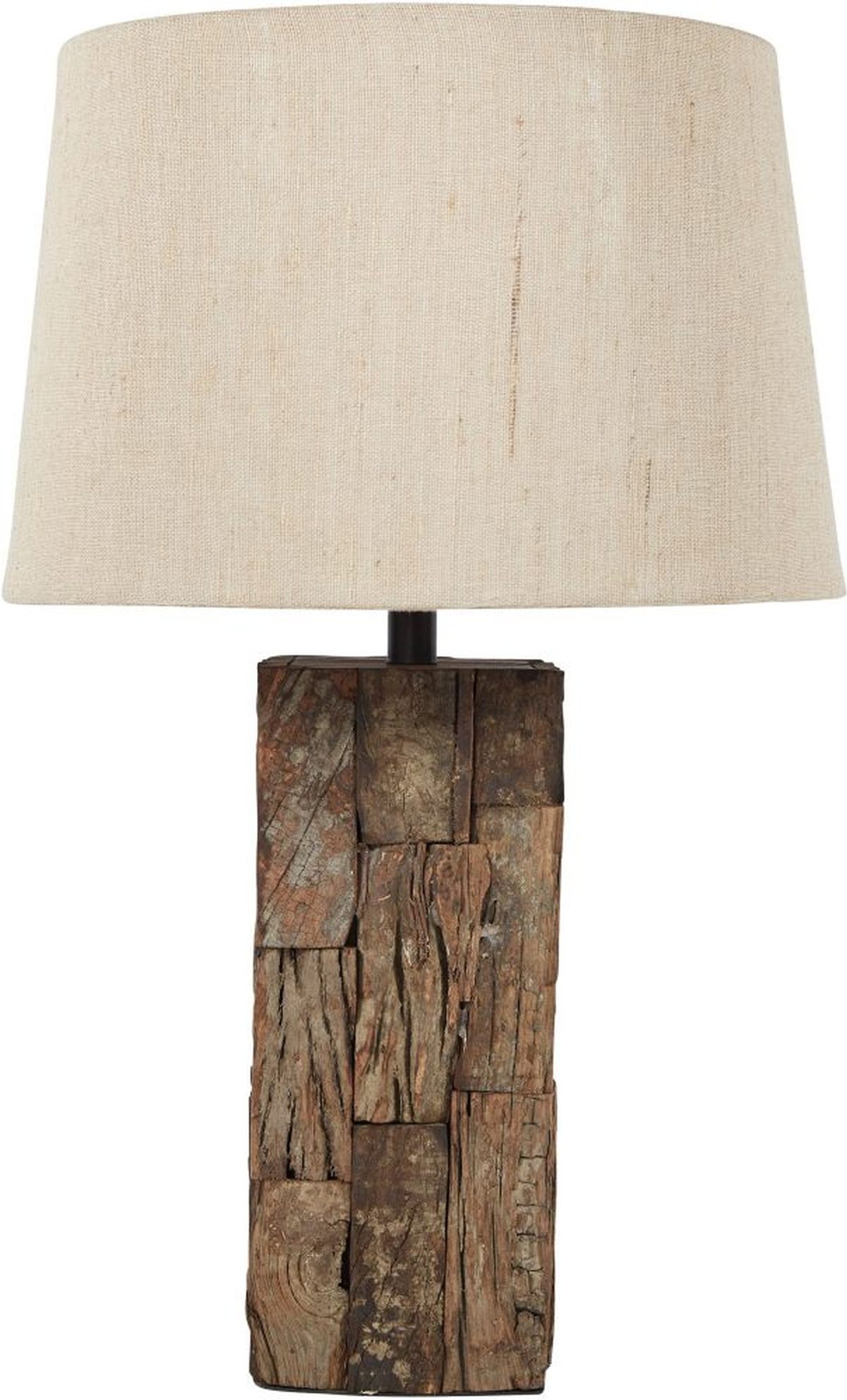 The Selemah table lamp features a reclaimed wood base made from carefully placed pieces in a jigsaw style, so no two lamps are alike. The modified, fabric drum shade creates warm, diffused light that will brighten up your living space