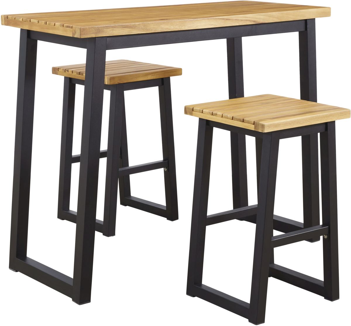 Bring an uptown feel to an outdoor space with this 3-piece outdoor furniture set. An especially smart choice for small spaces, this ultra-cool counter-height outdoor table and stool set sets a new standard in outdoor living. The tabletop and seats are richly crafted of acacia wood with wonderful tonal variation. The tubular steel legs are sleek, sturdy and slightly canted for an interesting angled effect.
